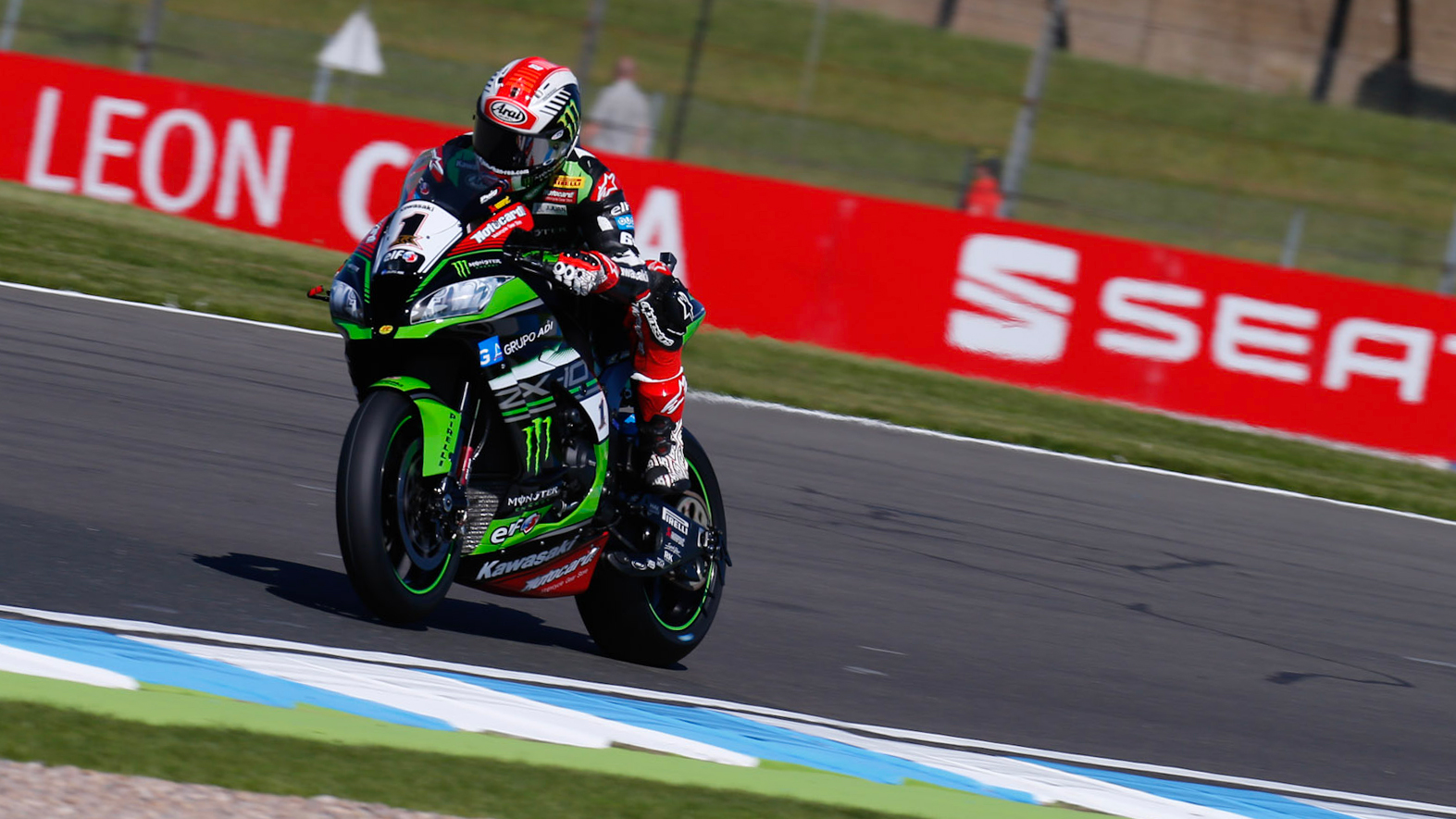 Jonathan Rea (Kawasaki Racing Team) konnte den Freitag sehr positiv geniessen, auch mit einem unüblichen Sturz im FP1 steht er an der Spitze der Ergebnisliste beider Sessions bei der PATA UK Round.
