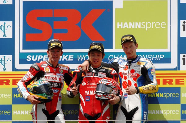 At the start of race 1 the unpredictable weather was back again, a downpour with some hail fell on the track and the start had to be delayed, but by the time the riders were back on the grid after they repeated the start procedure, the sun was out... Polesitter Max Neukirchner was not the fastest off the line in race 1, and Bayliss took the lead. Max followed, then Corser and Haga. Soon afterwards Max lost his place to the Yamaha riders and by the end of lap 1 the aforementioned riders plus Michel Fabrizio were pulling away from the rest. On lap 2 Bayliss went wide at turn 1, the first of many mistakes by the Australian rider, who at the end of the day had lost several positions and precious World Championship points. Haga then took the lead, but wasn't able to pull away, and the leading group remained the same until Fabrizio lost contact around lap 5, then Corser followed the same destiny. It didn't take long also before Neukirchner followed suit on lap 9, leaving Haga and Bayliss to fight for the win. On lap 14 Bayliss made his first attempt to pass at turn 1 ending wide once again, with Haga quickly recovering his lost position. The Australian then opted for another place to pass the Japanese rider, the Veedol chicane, and managed to grab the lead on lap 16, but next time around at the first turn went wide once again. Haga wasn't able to pass, but on the following lap Haga attacked hard under braking and Bayliss to defend his position ended up in the gravel trap, recovering just before Neukirchner arrived on the scene. This gave Haga a four second advantage two laps to the end and it was easy for the Japanese rider to take the win.