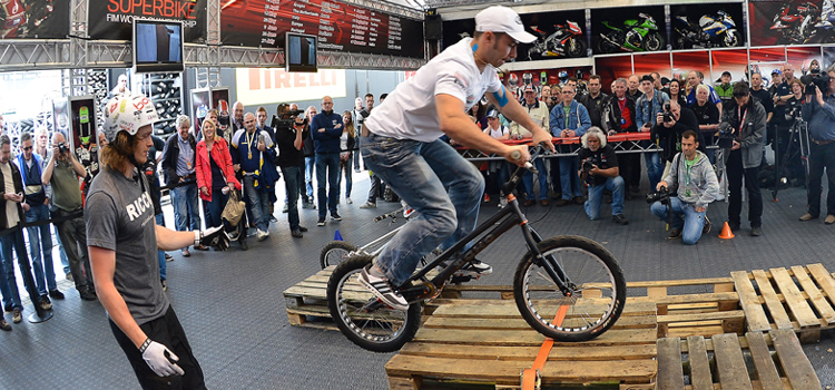 At the SBK Paddock Show, Rick Koekoek first demonstrated his own bike trial skills and then taught the basics to his one-time students. The award for the best bike trial rookie went to Leon Haslam, the only one able to perform every increasingly-difficult task required by Rick Koekoek. All riders were on the stage afterwards for a quick interview session.