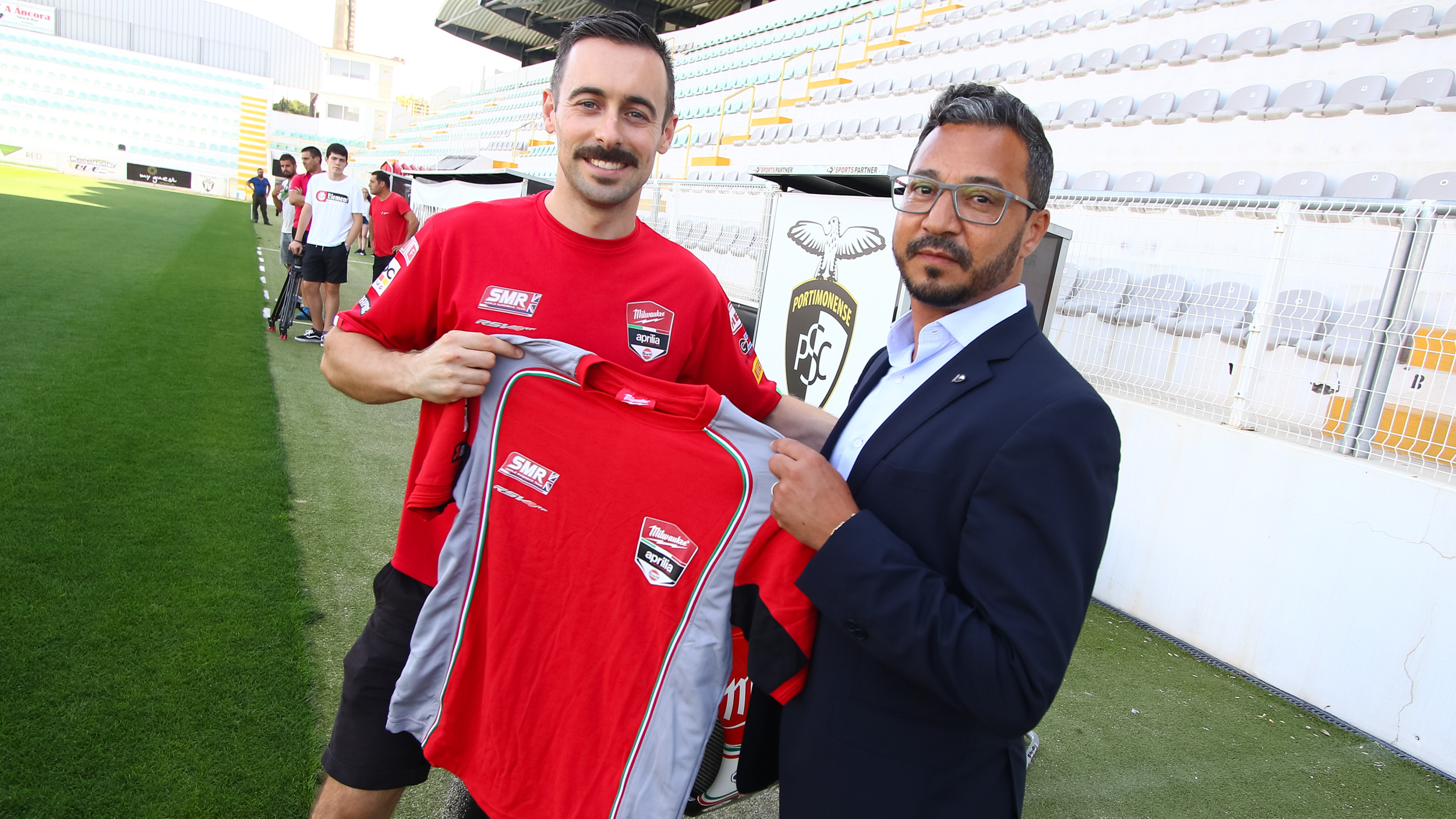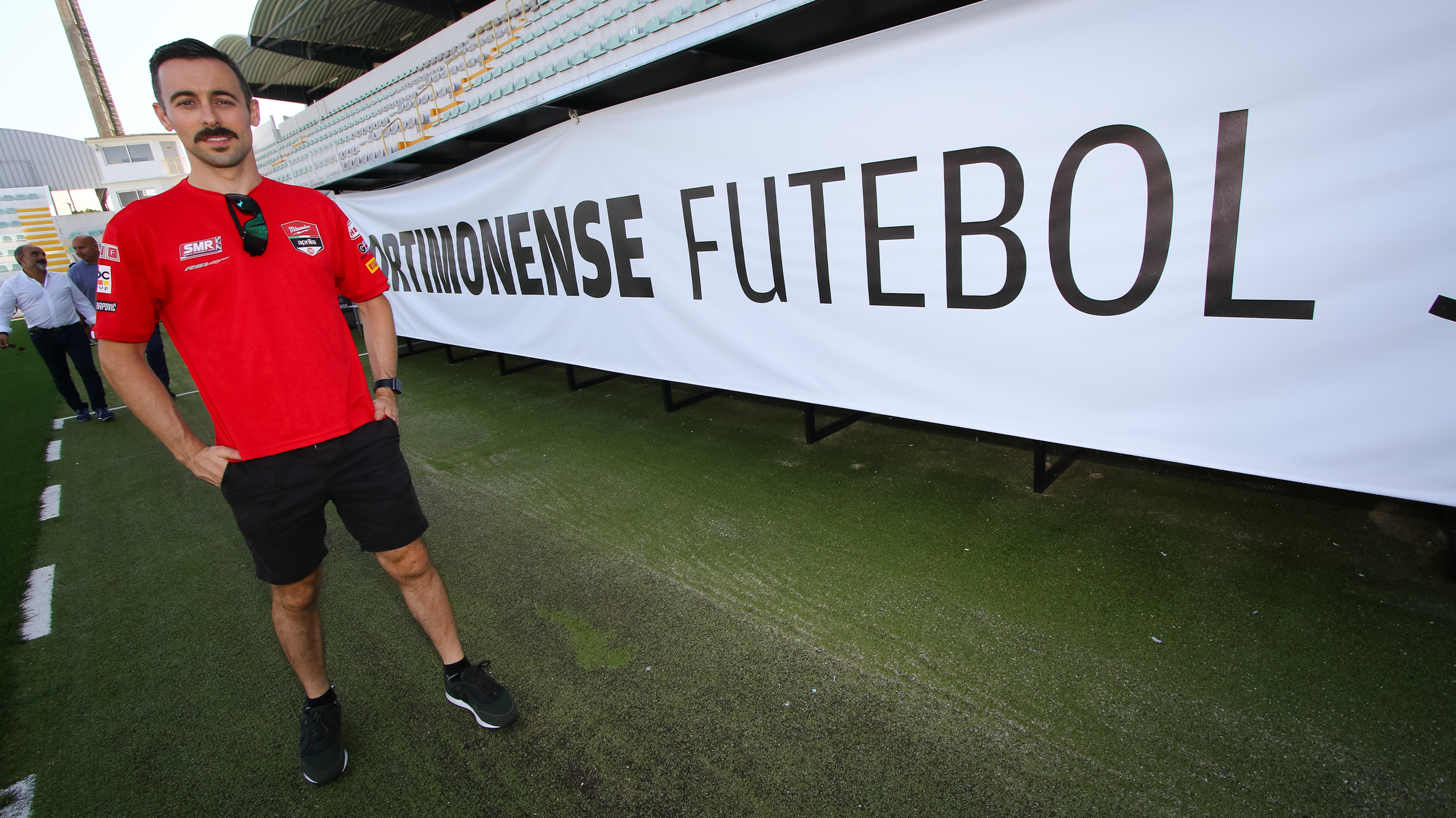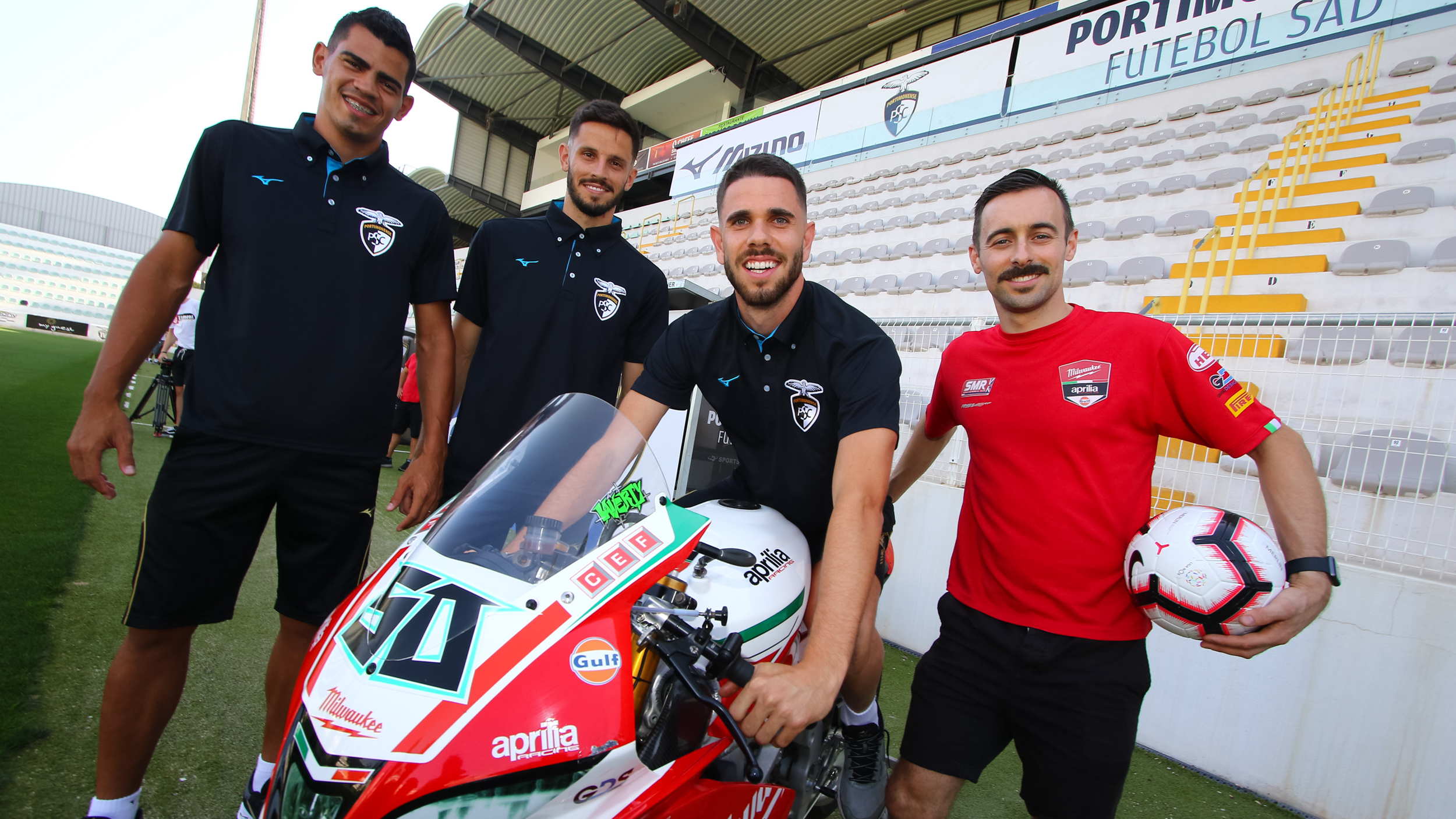 The Irishman took his #50 Aprilia RSV4 to the stadium of Primeira Liga team Portimonense Sporting Clube and met up with several team players on the pitch itself, as well as with Portimonense’s president. The club originates from and plays its matches in Portimao, only a few miles away from the Autodromo Internacional do Algarve where the Nolan Portuguese Round will take place this weekend.