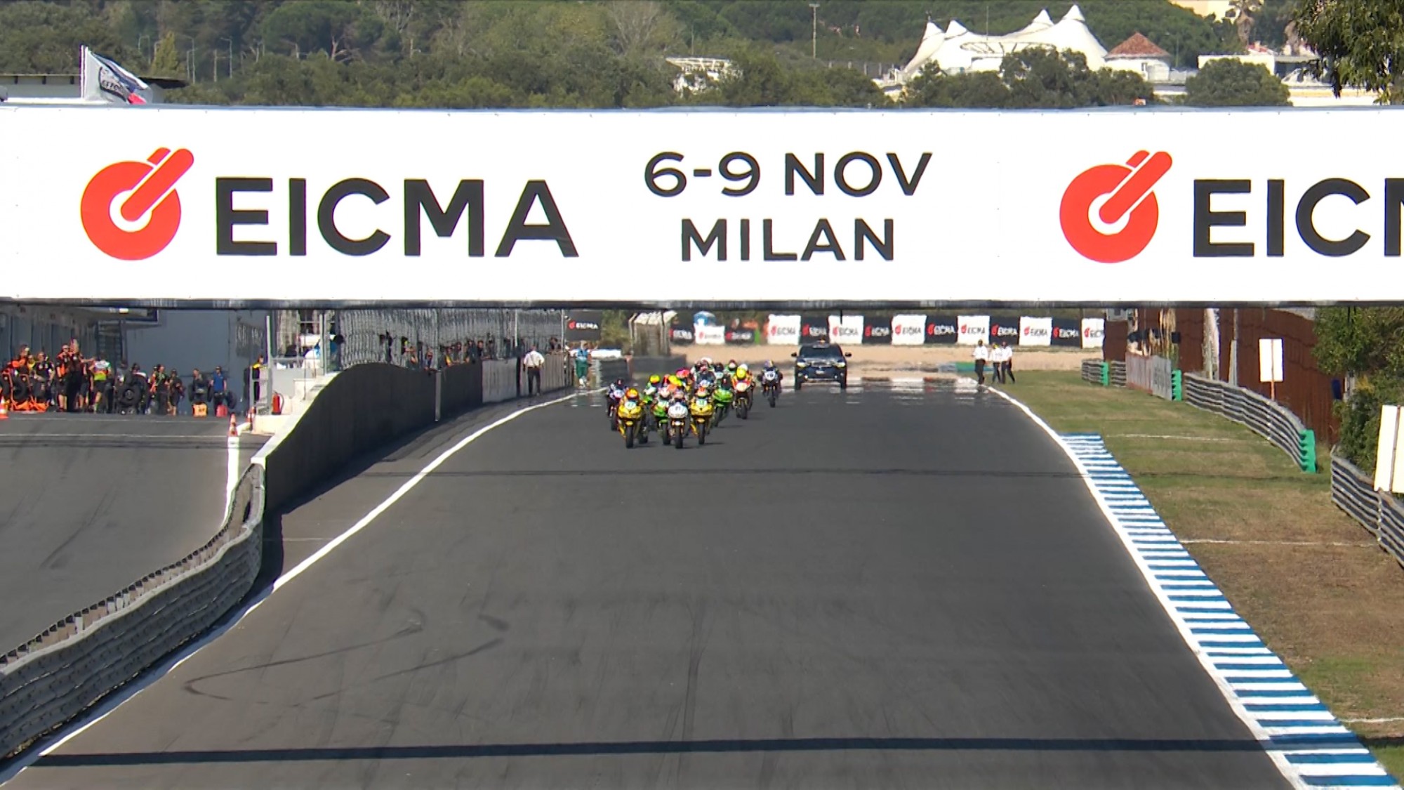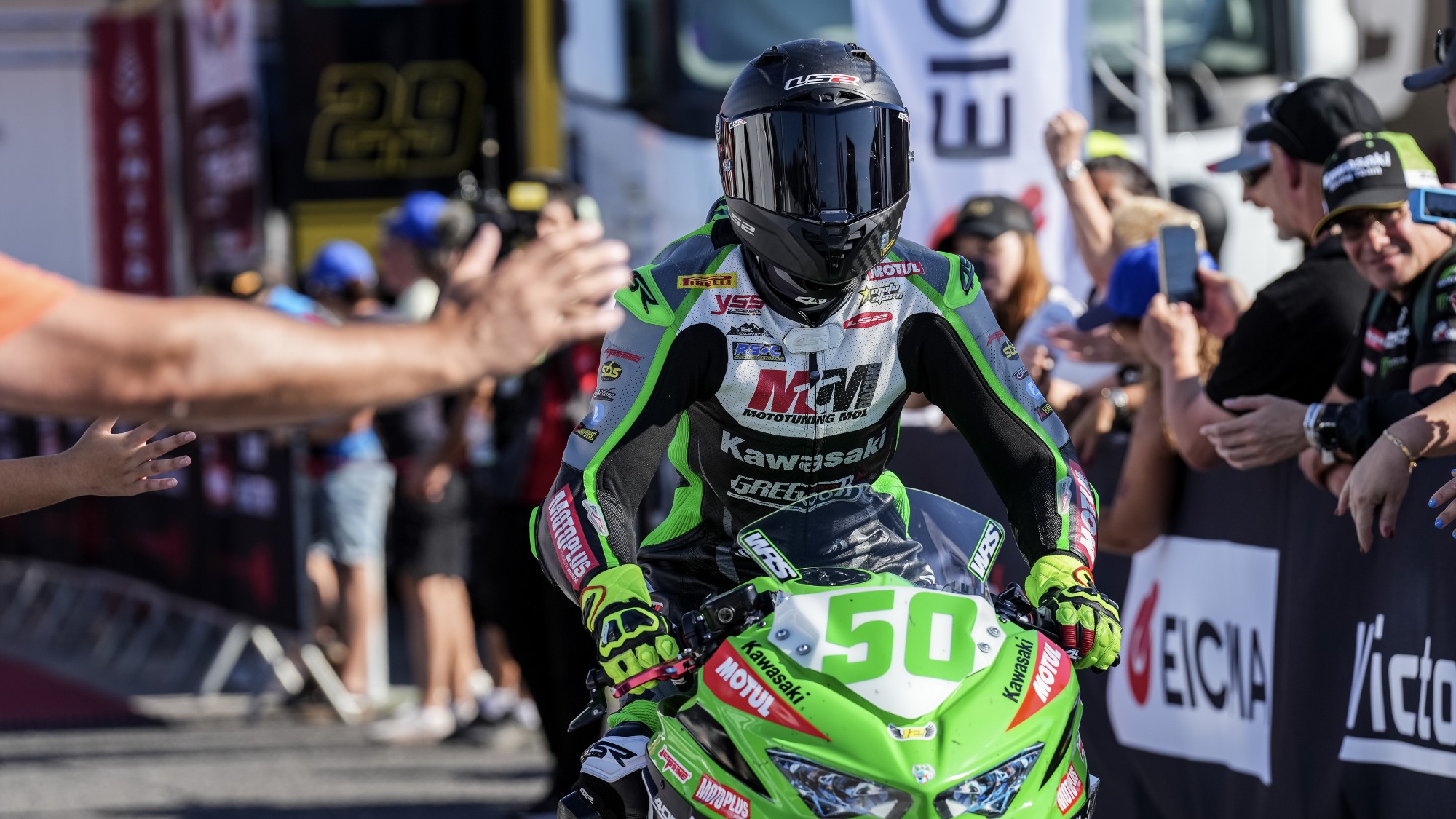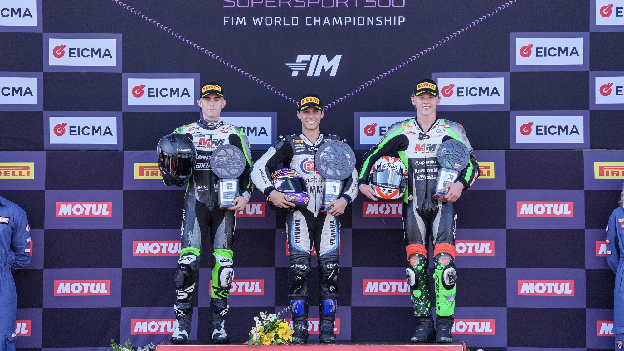 Racing action at the first day of the EICMA Estoril Round was closed out on Saturday with the FIM Supersport 300 World Championship’s Matteo Vannucci (PATA AG Motorsport Italia WorldSSP300) taking his fifth career win in the category. Teammates Carter Thompson (MTM Kawasaki) and Loris Veneman (MTM Kawasaki) both made dramatic late moves to get onto the podium ahead of the title leader Benat Fernandez (Team #109 Retro Traffic Kove). #50’s P2 spelled a fifth podium of the season for Thompson and a tenth career podium for his #71 Dutch teammate.