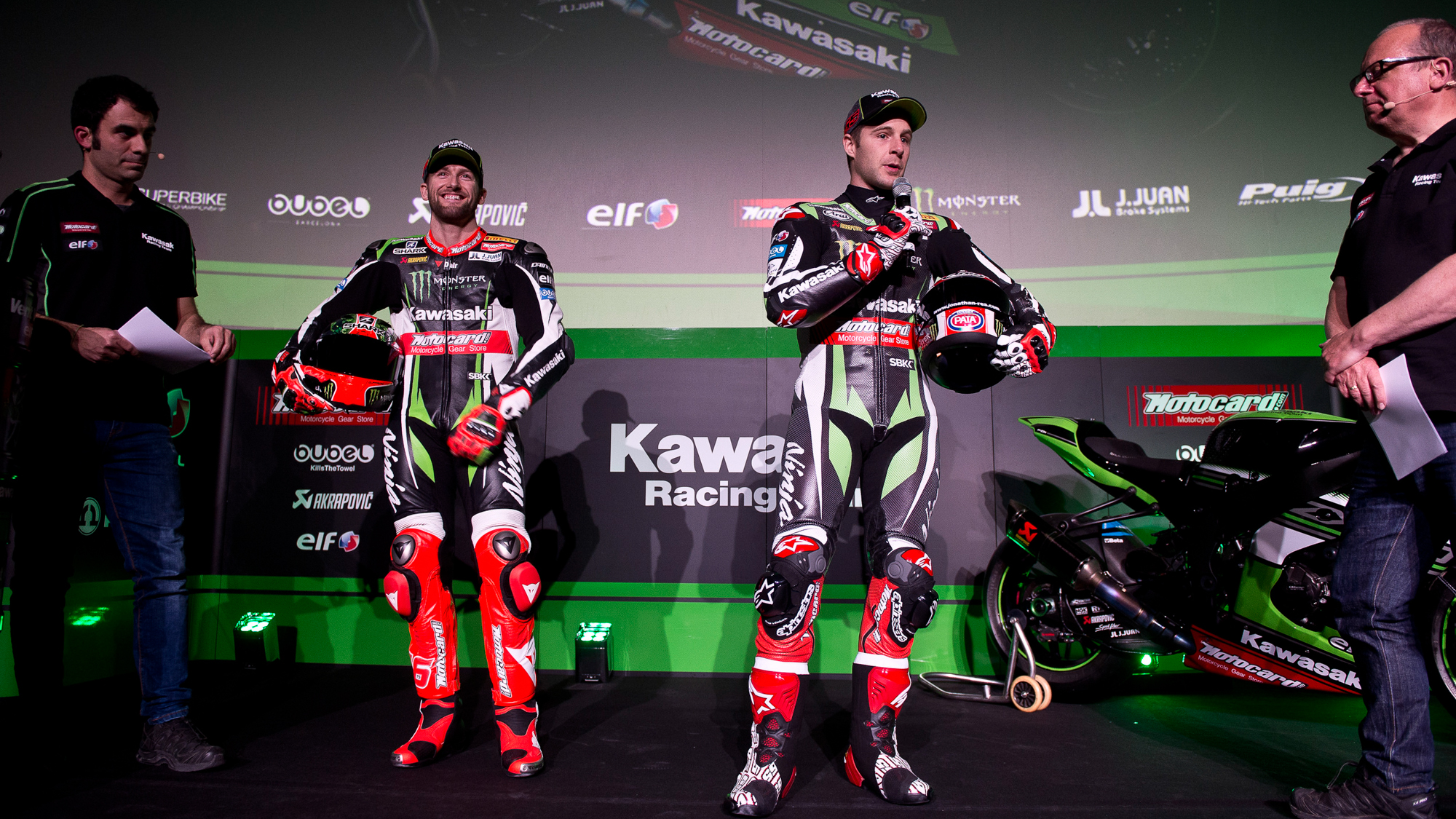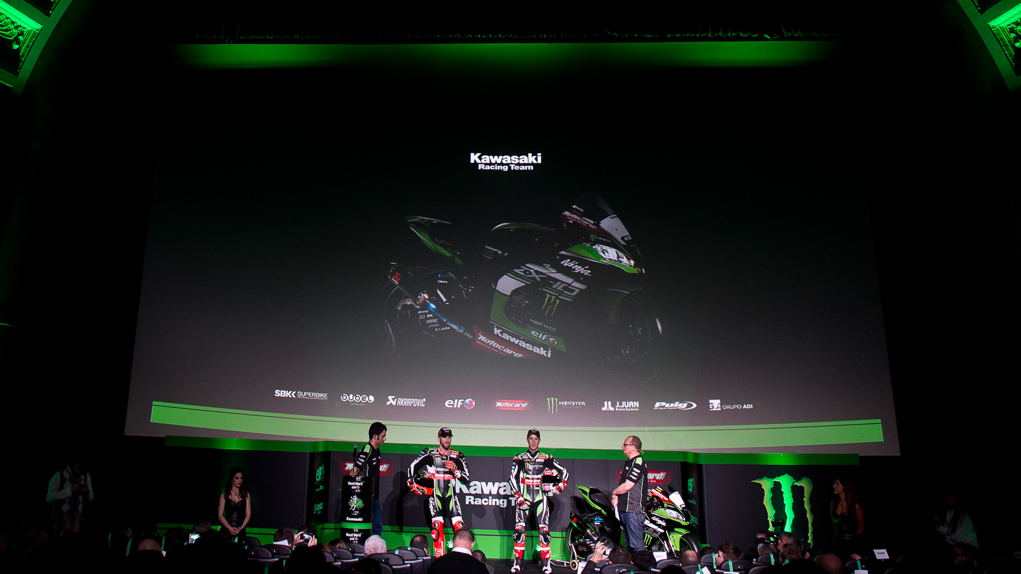 Jonathan Rea y Tom Sykes protagonizaron ayer jueves el acto de presentación del Kawasaki Racing Team, celebrado en el céntrico Cine Comedia de la Ciudad Condal. El dúo del Reino Unido compartió los focos con las nuevas Ninja ZX-10RR, que ayer exhibían ya la imagen definitiva que se podrá ver en los 13 Rounds de la campaña 2017.