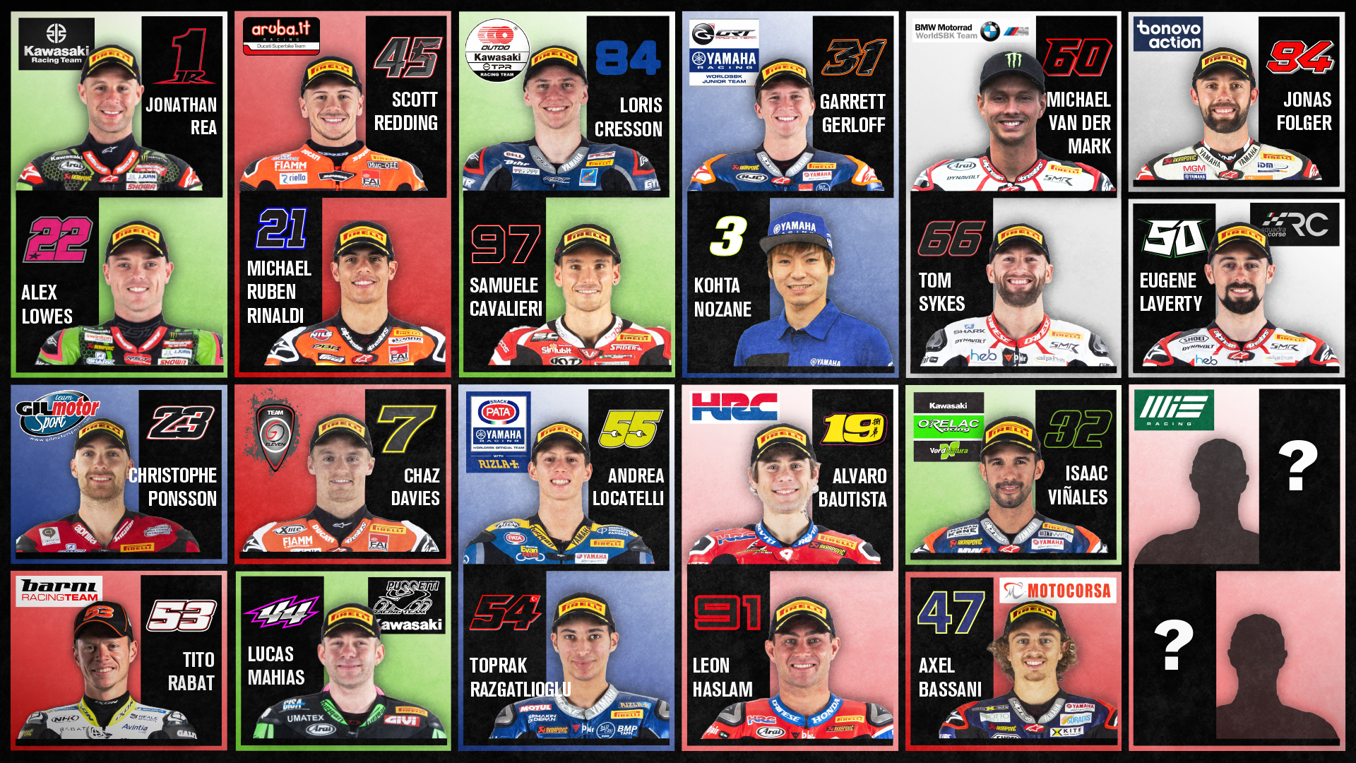 La parrilla de la categoría reina contará esta temporada con tres equipos nuevos, incluyendo dos satélites de BMW, ya que el fabricante alemán amplía su presencia en WorldSBK. Eugene Laverty estará en el RC Squadra Corse y Jonas Folger en el Bonovo MGM Action poniendo en sus manos la nueva BMW M 1000 RR. El Gil Motor Sport – Yamaha también será una de las novedades con Christophe Ponsson, que vuelve al campeonato tras su participación como wild card la pasada campaña.