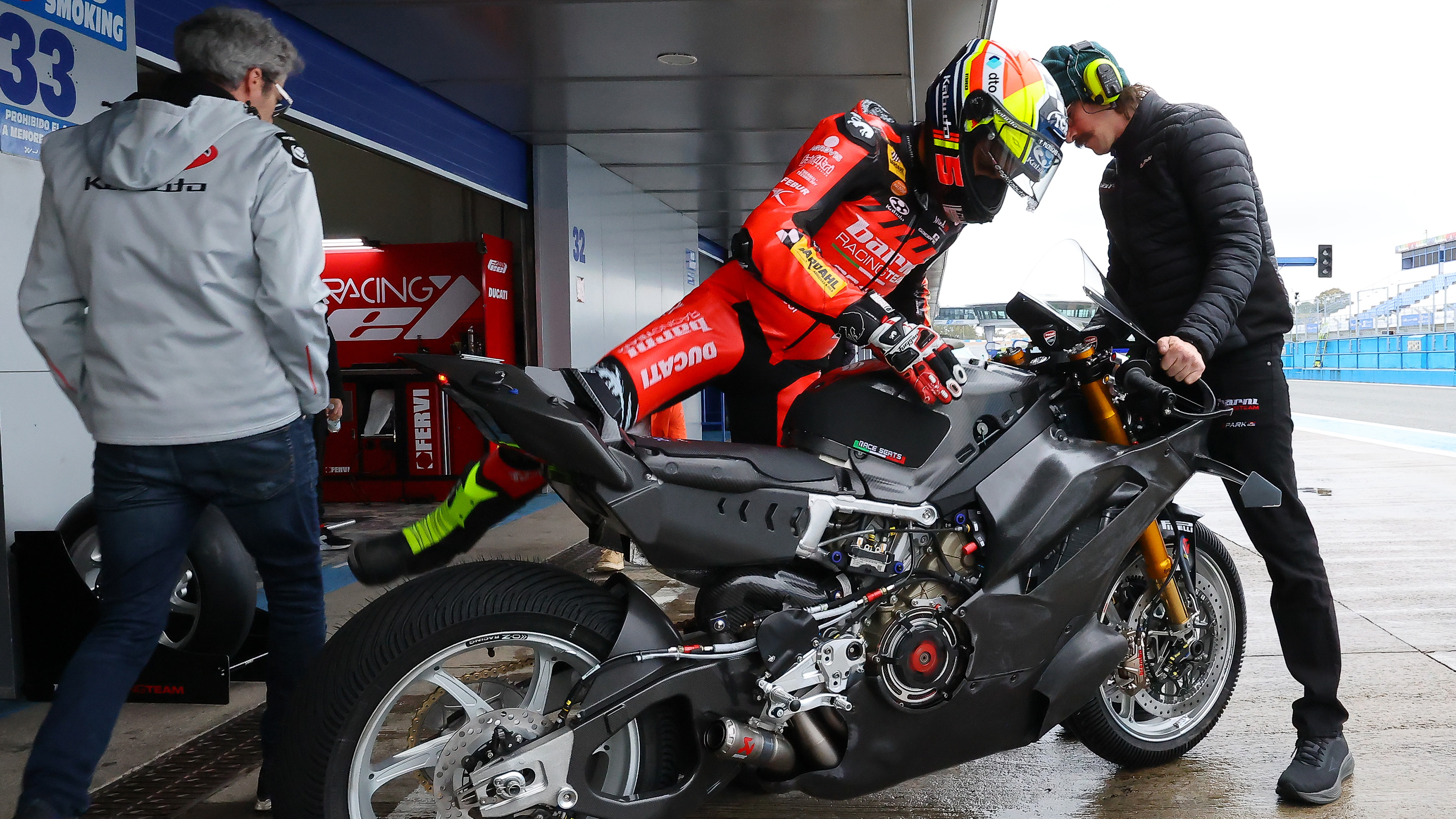 13:04 – Iker Lecuona (Aruba.it Racing - Ducati) completa su primera vuelta del día. Es probable que su compañero, Nicolo Bulega, no participe en la primera jornada, ya que sigue lloviendo en Jerez.