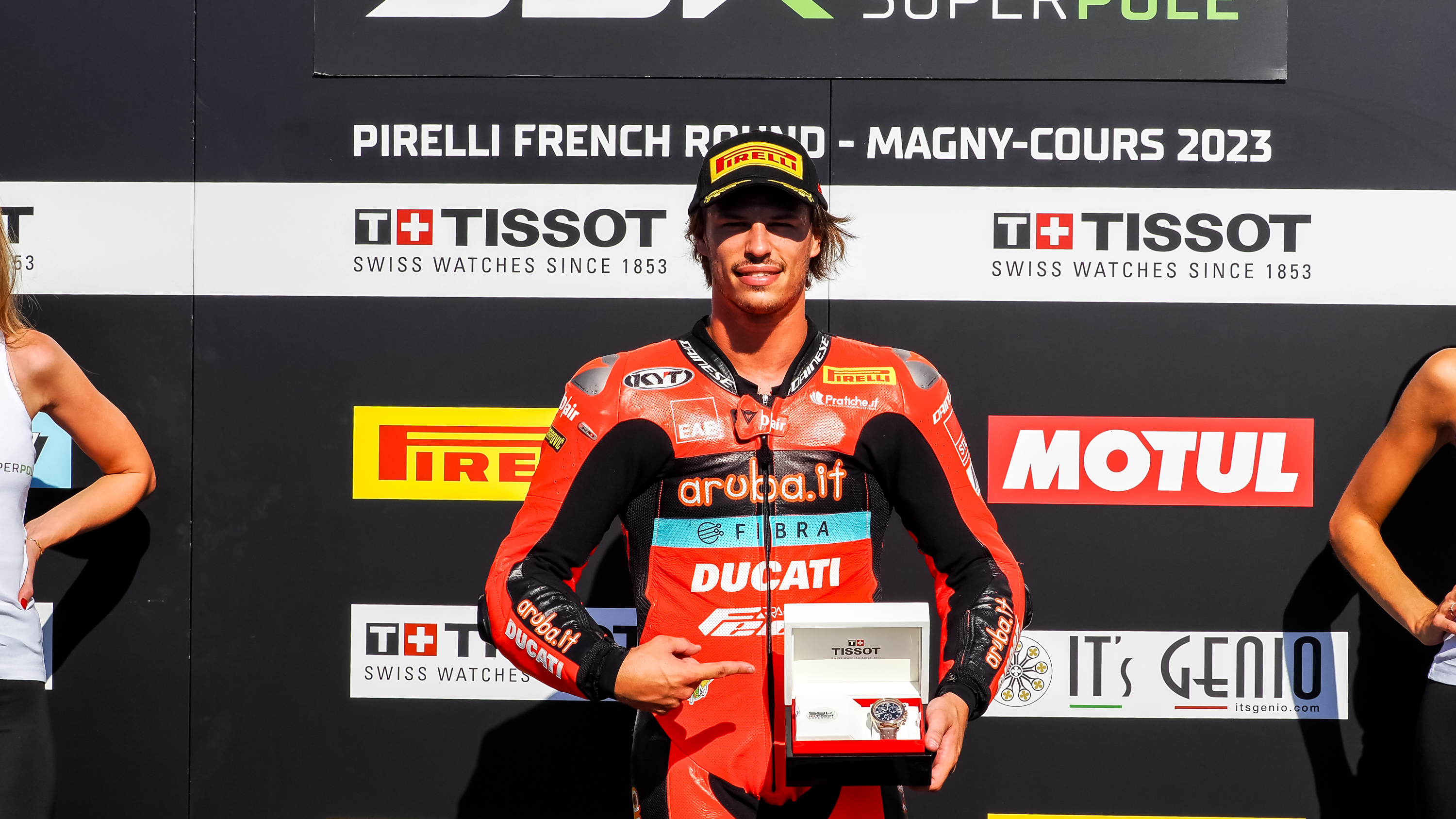À mi-séance, les drapeaux rouges ont été déployés après un incident impliquant Can Oncu (Kawasaki Puccetti Racing) et Maximilian Kofler (D34G Racing) au virage 13, les deux pilotes ayant réussi à s'éloigner de l'accident. Oncu a pris la 21e place sur la grille pour son retour de blessure et Kofler la 30e. À la reprise de la séance, Debise a immédiatement réduit l'écart à seulement 0,003 seconde du pilote Ducati dans une lutte épique pour la pole. Le n°11 a amélioré son avant-dernier tour lancé en 1'40.074s, se rapprochant de la tranche des 1'39s pour décrocher sa septième pole position. Debise partira de la deuxième place après avoir décroché son meilleur résultat en Superpole et sa première première ligne, tandis que Raffaele De Rosa (Orelac Racing VerdNatura) a pris la troisième position après une amélioration tardive en 1'40.366. La pole position de Bulega lui a également valu le Tissot Superpole Award pour 2023.