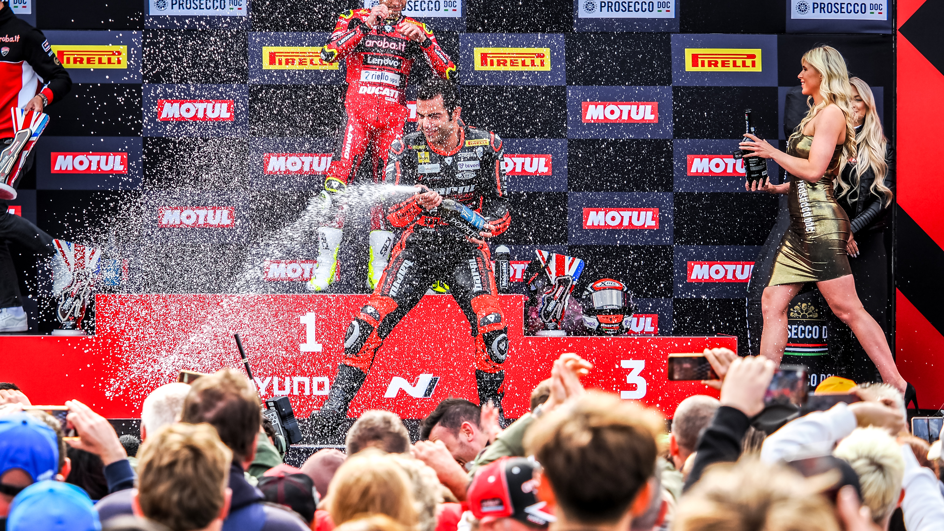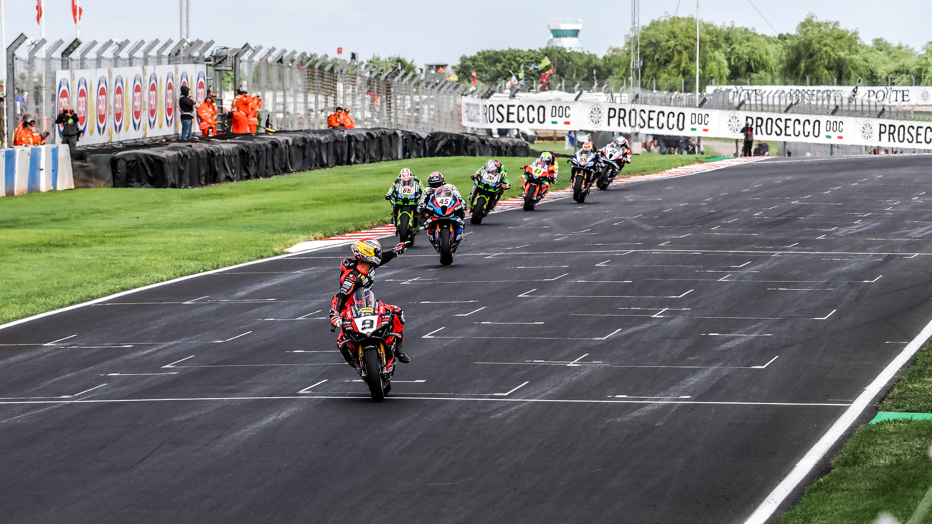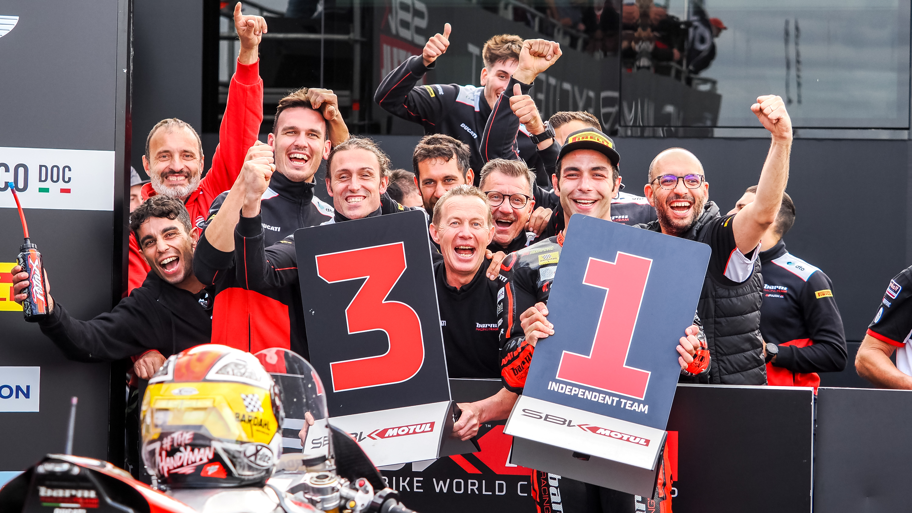 La période de disette du team a failli prendre fin dans la Course 1 à Donington Park, mais Petrucci, de retour sur le circuit pour la première fois depuis 2009, a gardé une image claire de Misano, arrêtant une charge tardive qu'il était en train de mener sur Jonathan Rea (Kawasaki Racing Team WorldSBK), qui a finalement pris la troisième place : « J'avais une image claire dans mon esprit du propriétaire de l'équipe, Marco, avec sa tête dans ses mains à Misano, et j'ai pensé : 'Je ne veux pas répéter cela encore une fois !' J'étais donc à la limite. Jonny a peut-être fait deux ou trois erreurs et j'ai pu le rattraper, mais dans les deux derniers tours, je me suis dit que je n'avais plus rien à donner. J'ai décidé qu'il valait peut-être mieux marquer des points ! »