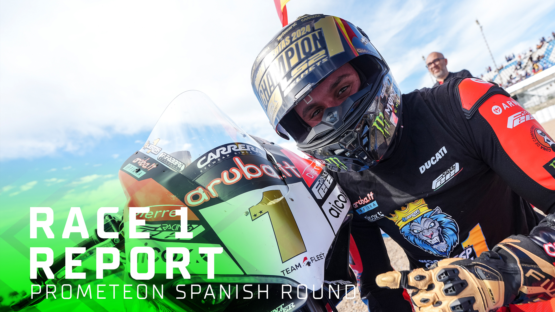Les spectateurs du Round Prometeon d'Espagne ont eu de quoi se réjouir durant la Course 1 du Championnat FIM World Supersport. Adrian Huertas (Aruba.it Racing WorldSSP Team) a en effet coiffé la couronne sur ses terres grâce à une troisième place à l'arrivée.