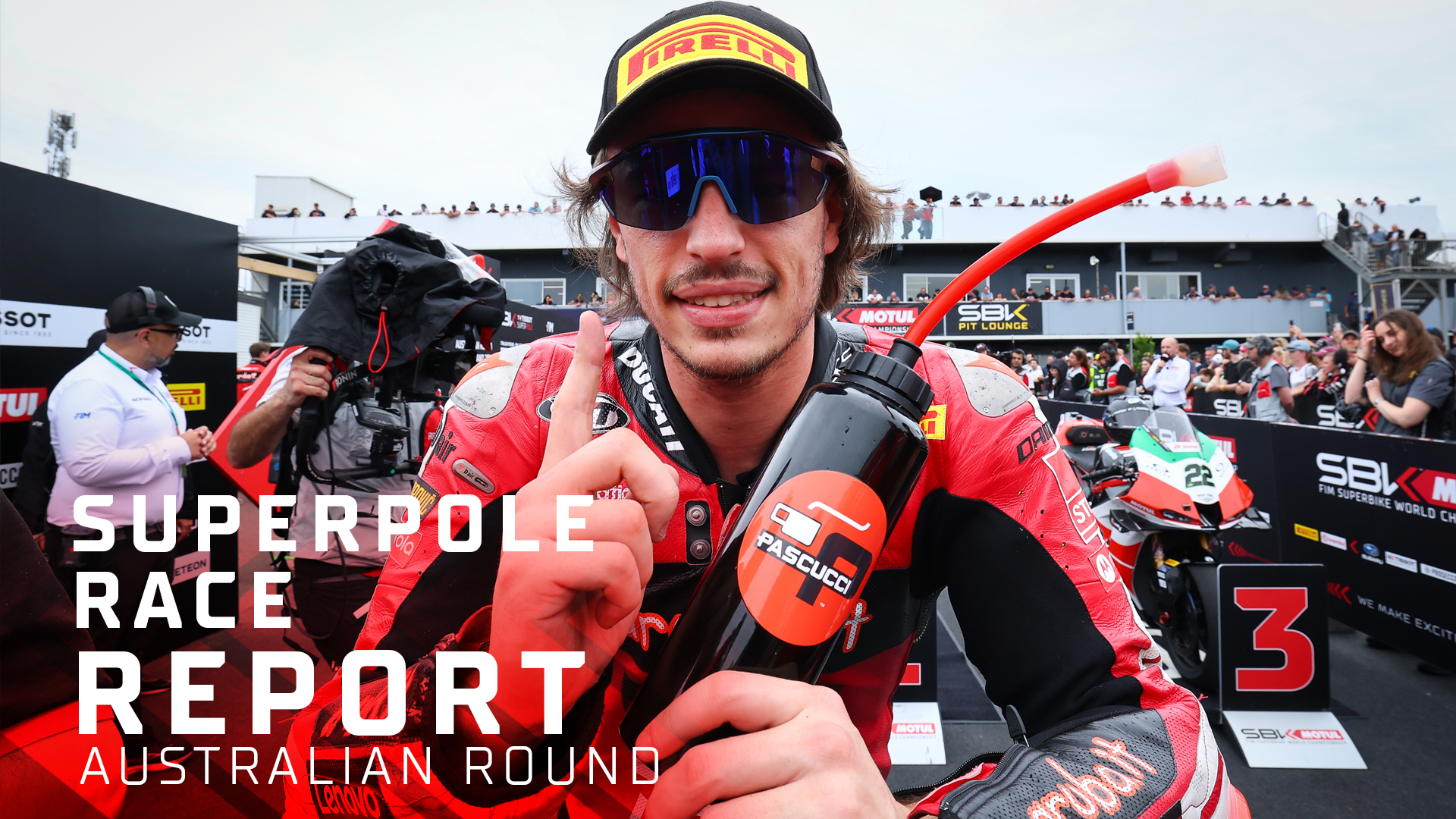 Nicolo Bulega (Aruba.it Racing - Ducati) a continué sur sa lancée ce dimanche lors du Round d’Australie du Championnat MOTUL FIM World Superbike, mais ce fut tout sauf une promenade de santé pour le n°11. Après avoir perdu du terrain au départ, il s’impose devant Axel Bassani (bimota by Kawasaki Racing Team), qui s’offre son premier podium avec Bimota (son premier depuis 939 jours). Son coéquipier Alex Lowes complète le podium..