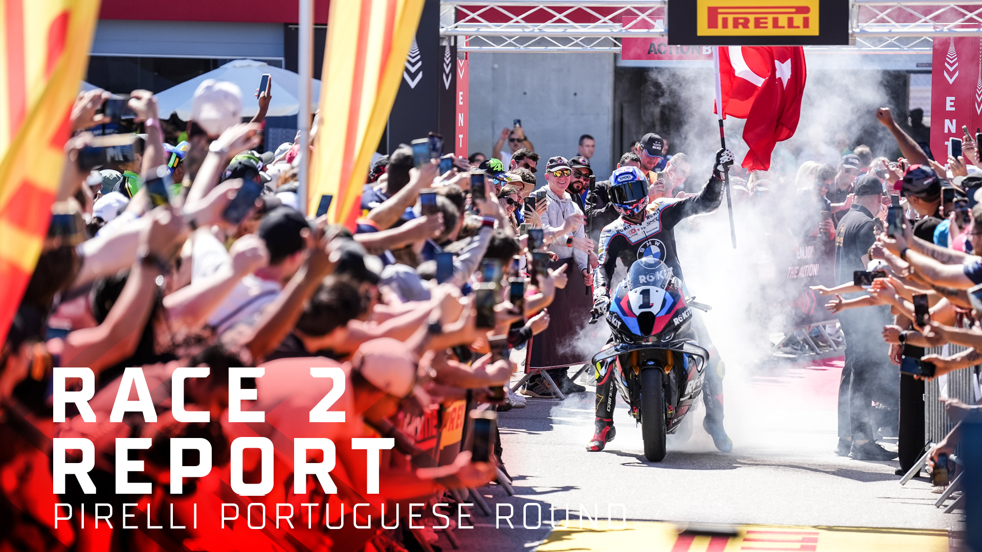 Il Round Pirelli del Portogallo del Campionato del Mondo MOTUL FIM Superbike è nel segno del duello tra Toprak Razgatlioglu (ROKiT BMW Motorrad WorldSBK Team) e Nicolò Bulega (Aruba.it Racing - Ducati). Gara 2 viene interrotta dalla bandiera rossa dopo la caduta al decimo giro di Jason O'Halloran (Pata Maxus Yamaha) in curva 1. Si riparte, ed ‘El Turco’ completa la tripletta centrando la sua nona vittoria sulla pista portoghese. Terzo posto per Alvaro Bautista (Aruba.it Racing - Ducati).